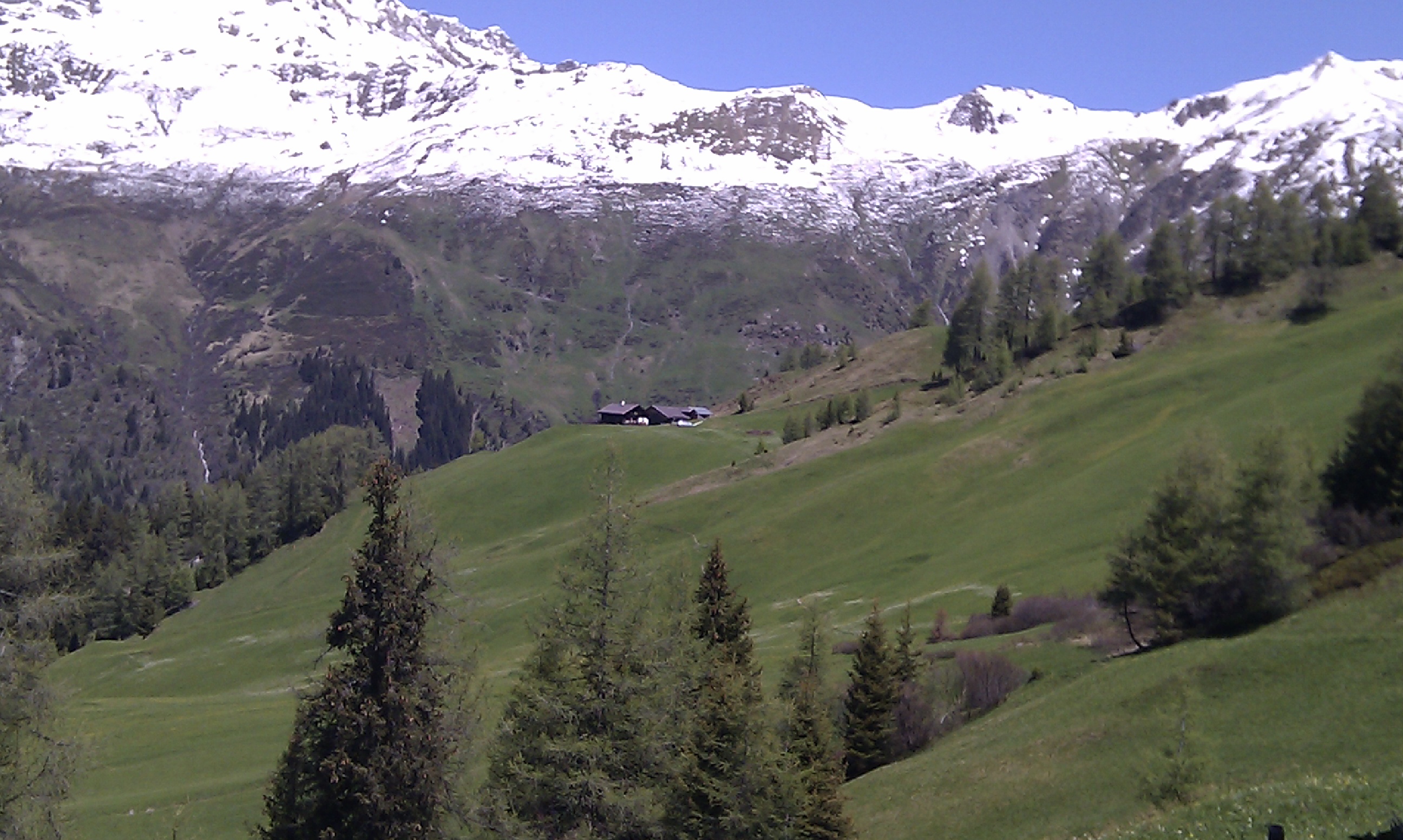 Vorbei an mehreren kleinen Bächen, immer wieder angenehm kühl zwischen den Bäumen hindurch, erreiche ich nach rund 35 min die Naviser Hütte (1.787 m) – leider ist diese nach acht Jahren Pause nur noch eine Ruine; Risse spalten das Haus mehrmals, der Verputz bröselt ab und die einstige Terrasse mit grandiosen Panorama verwildert.